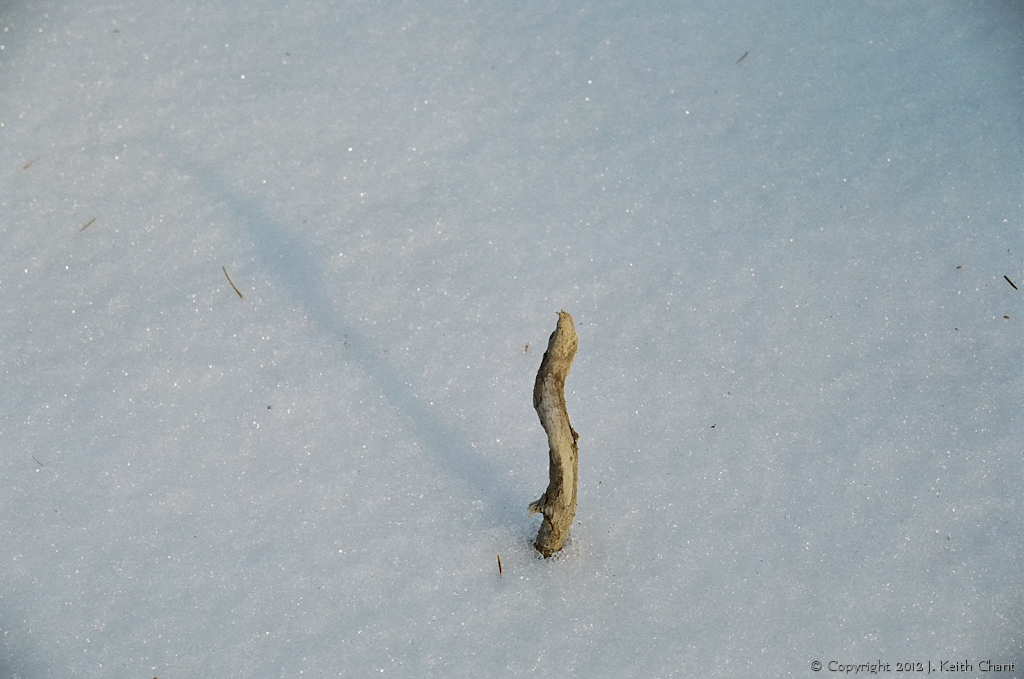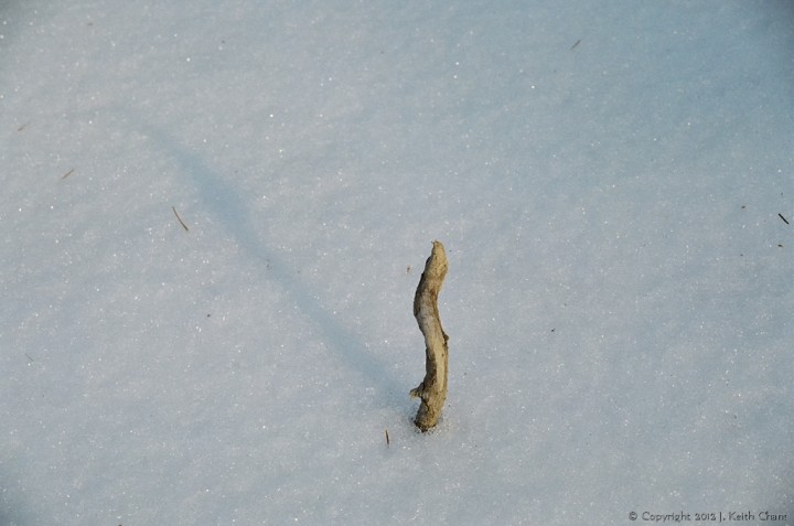 A twig brave enough to stand up through the snow, making its mark on the world.