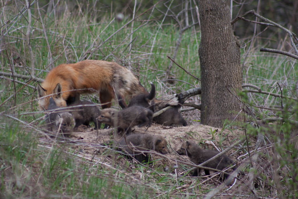 A mother fox with her cubs in the early spring.