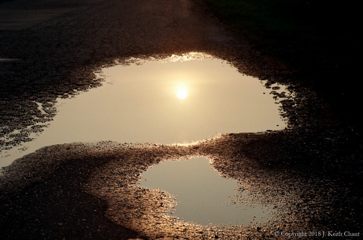 Sun reflecting off a puddle in the road.